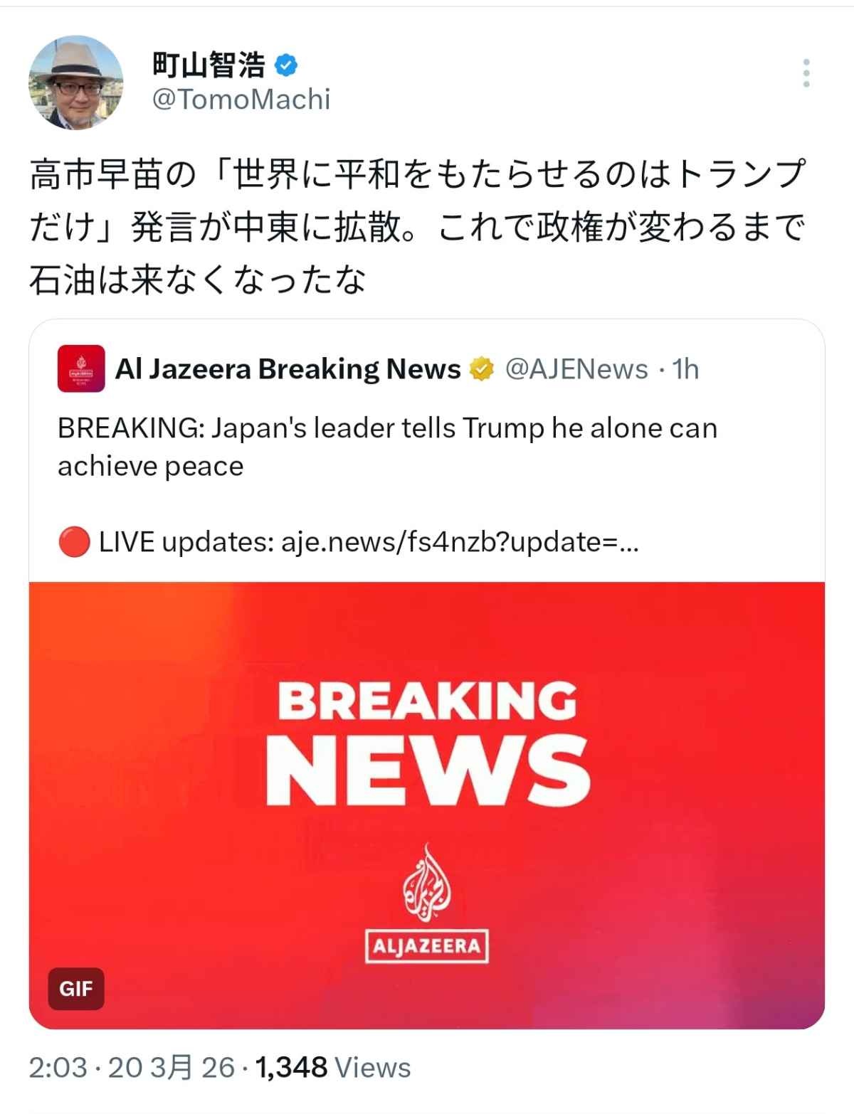 【悲報】高市首相「世界に繁栄と平和をもたらすのはドナルドだけ」⇒中東で大拡散! [115996789]
