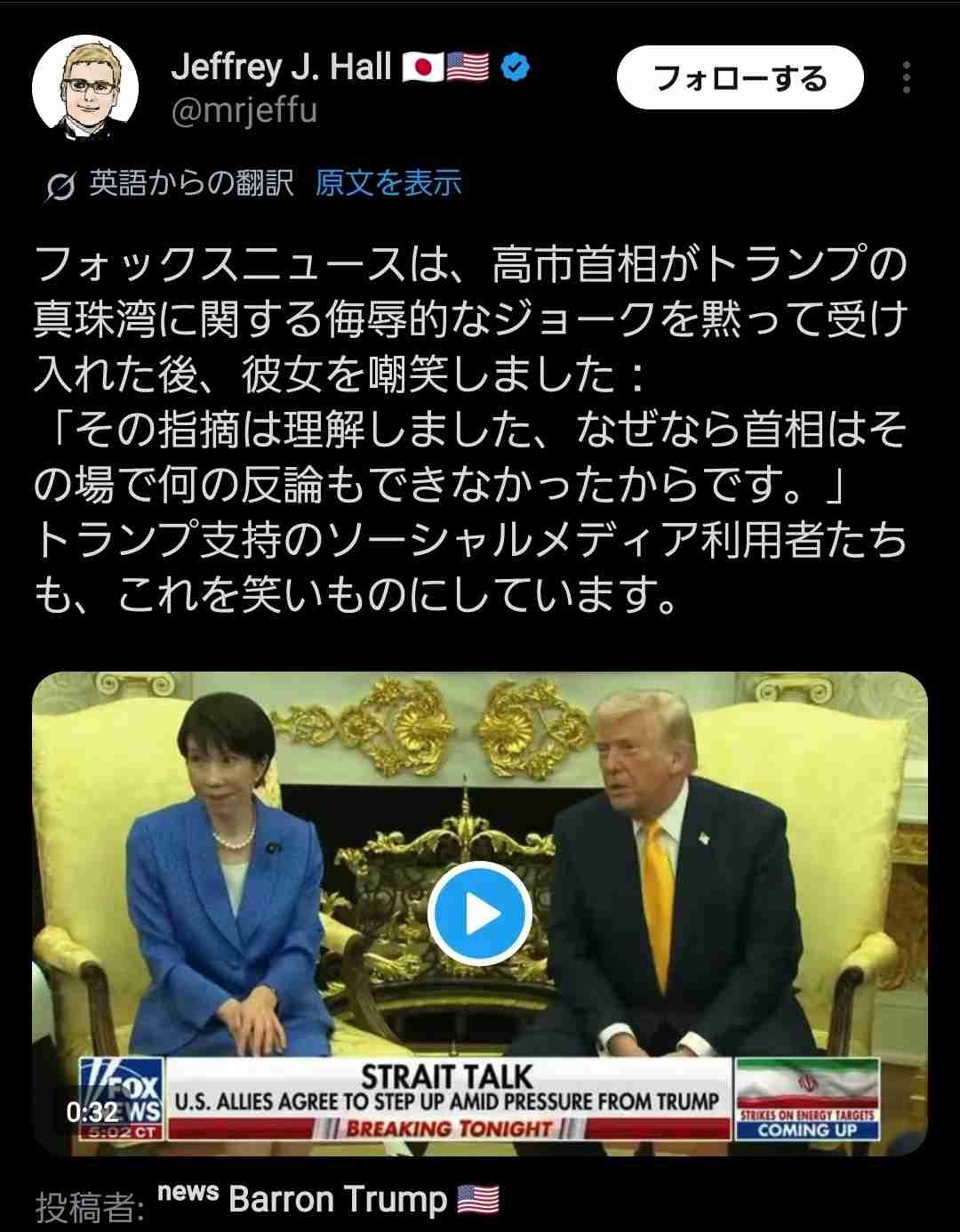 アメリカメディア「高市早苗、パールハーバーイジリをされても黙ってニコニコしていて草ァ!」