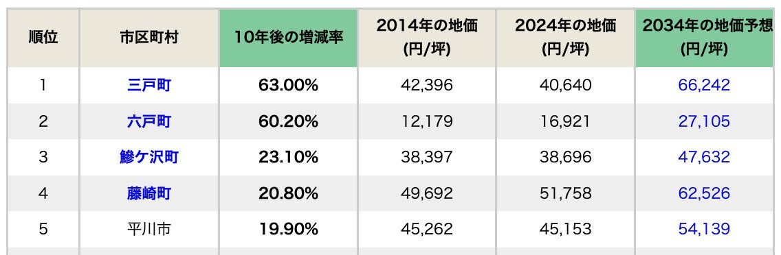 1位は三戸町で、10年後に63.00%増加、坪あたり6.6万円の予想となっています。青い森鉄道三戸駅から徒歩圏内。戦国時代の南部氏の居城であった三戸城跡や絵本「11ぴきのねこ」の舞台となる町として、数々の観光資源に恵まれます。人口減少により地価は年率約3%下落していますが、国道4号線が走り交通利便性は保たれています。そのエリアの公示地価地点で、過去の上昇率が高かった大字同心町字古間木平3番3について、不動産鑑定士は以下のように分析しています。「三戸町市街地西部の利便性が比較的良い住宅地域であるが、特段の変動要因はなく、地域経済の低迷、過疎化等により、住宅地に対する有効需要は減退しており、地価は下落傾向で推移するものと予測する」(2025年公示地価)とコメントしています。