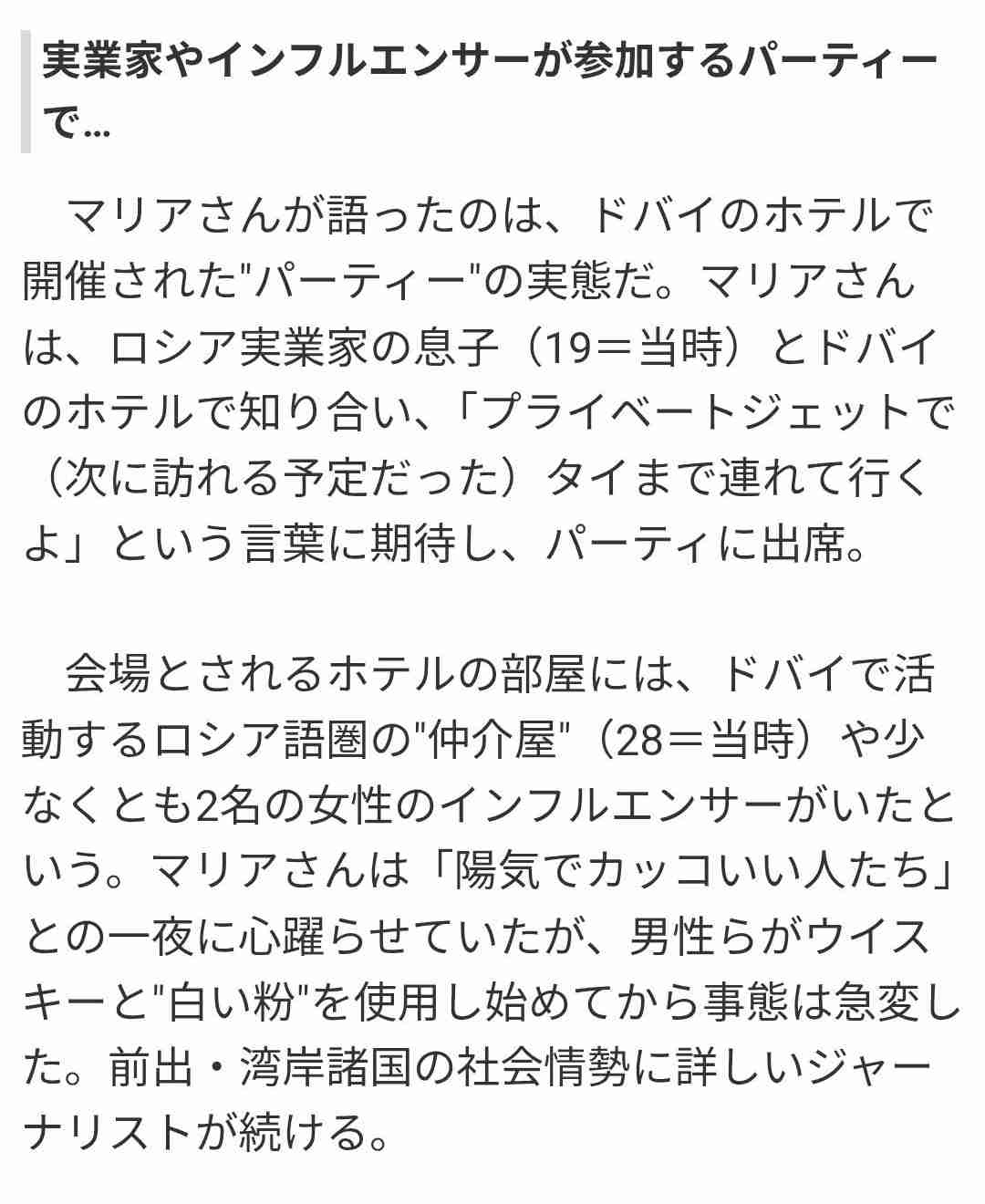 ・週刊誌のインタビューに「ドバイで出会ったロシアの実業家の息子(19)に誘われてパーティーに出た」と証言