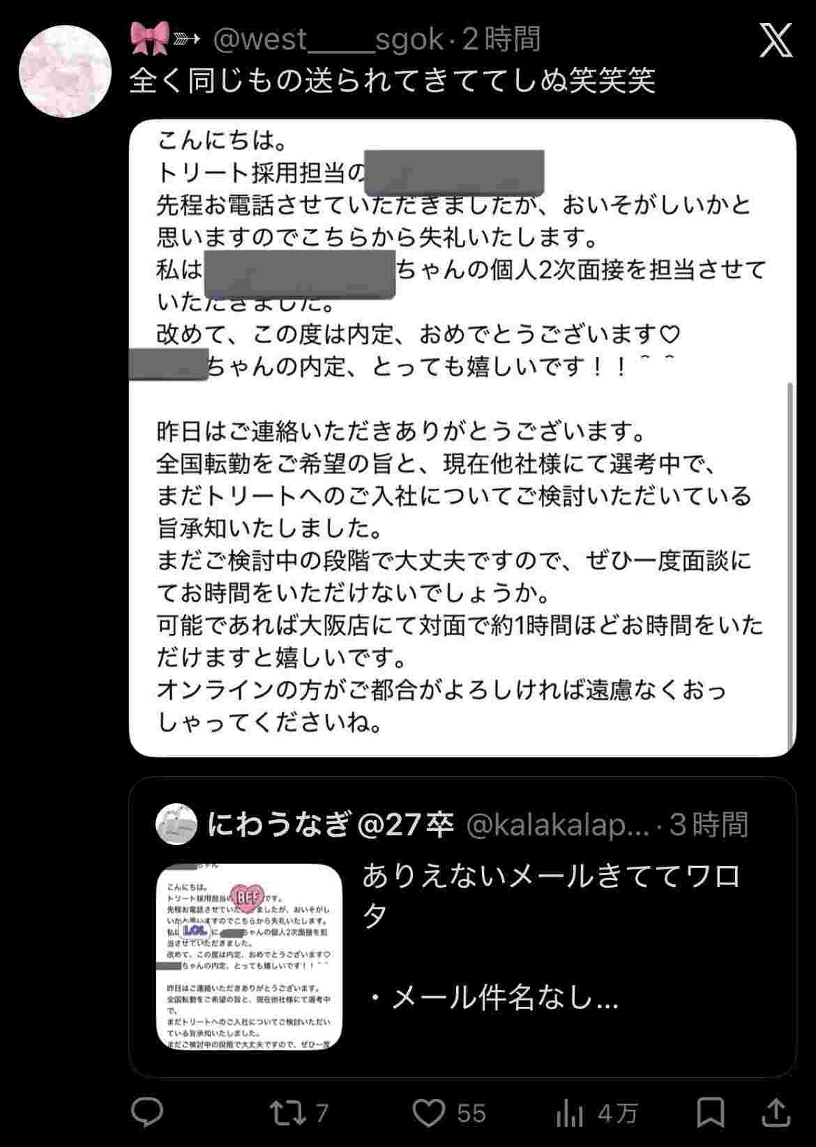 面接した覚えがないとか言ってるし迷惑メールを勘違いして晒してるだけじゃね?