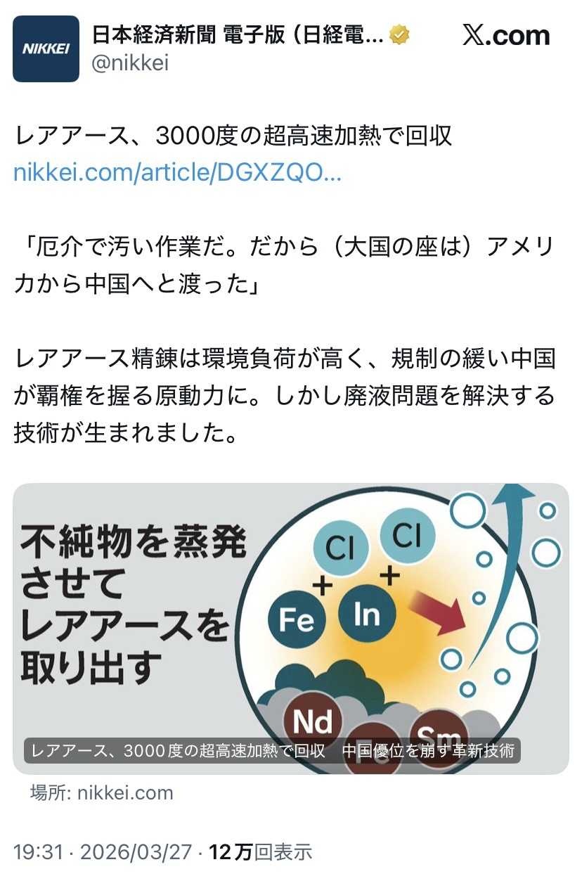 レアアース、3000度の超高速加熱で回収 中国優位を崩す革新技術 - 日本経済新聞