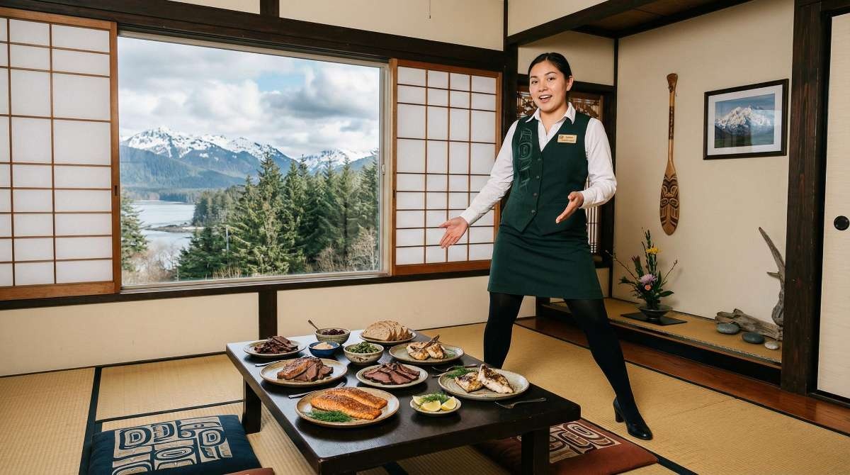 メインの食材: サーモン(キングサーモンやソッケーなど)、ハリバット(オヒョウ)、ムース、カリブー、リインディア(トナカイ)、シットカ鹿などの野生ゲーム。魚介が圧倒的に多い。