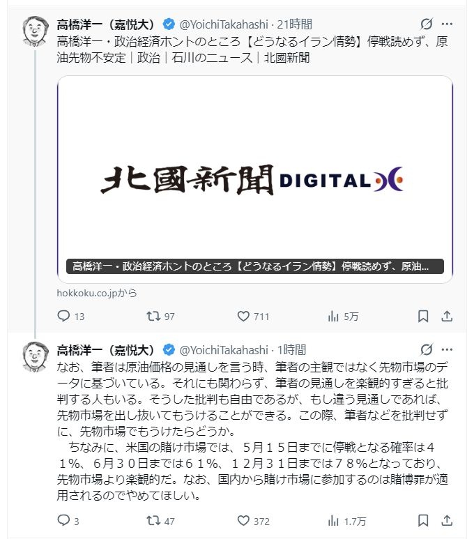賭け市場で先を見てんのかこいつ。高市のアドバイザーがこれってやべぇ国だな