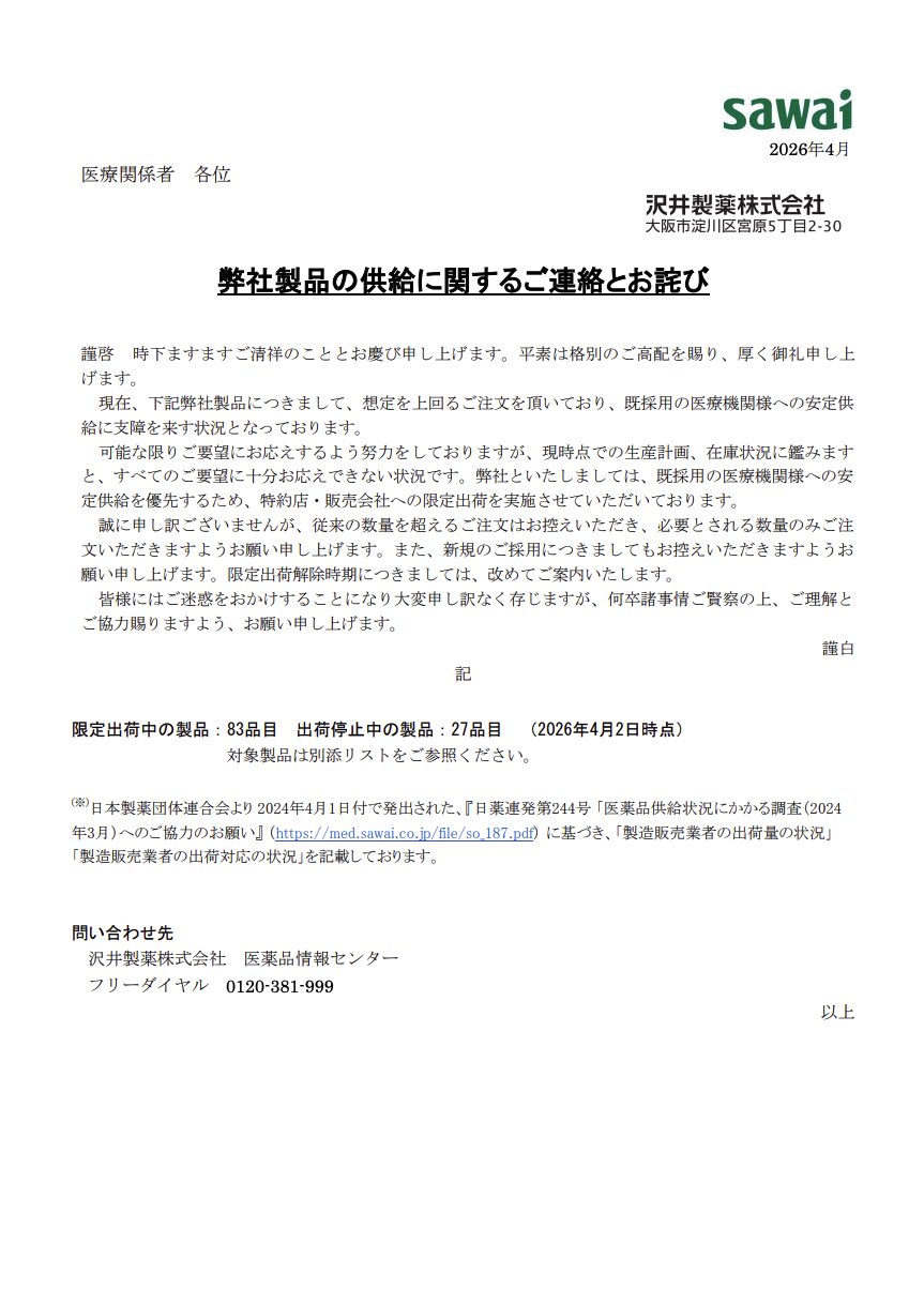 弊社製品の供給に関するご連絡とお詫びhttps://med.sawai.co.jp/file/pr27_1062_1.pdf