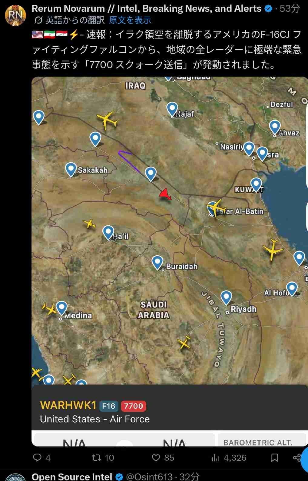 イラク飛行中のF-16CJからスコーク7700が発令!ベイルアウト…撃墜された?