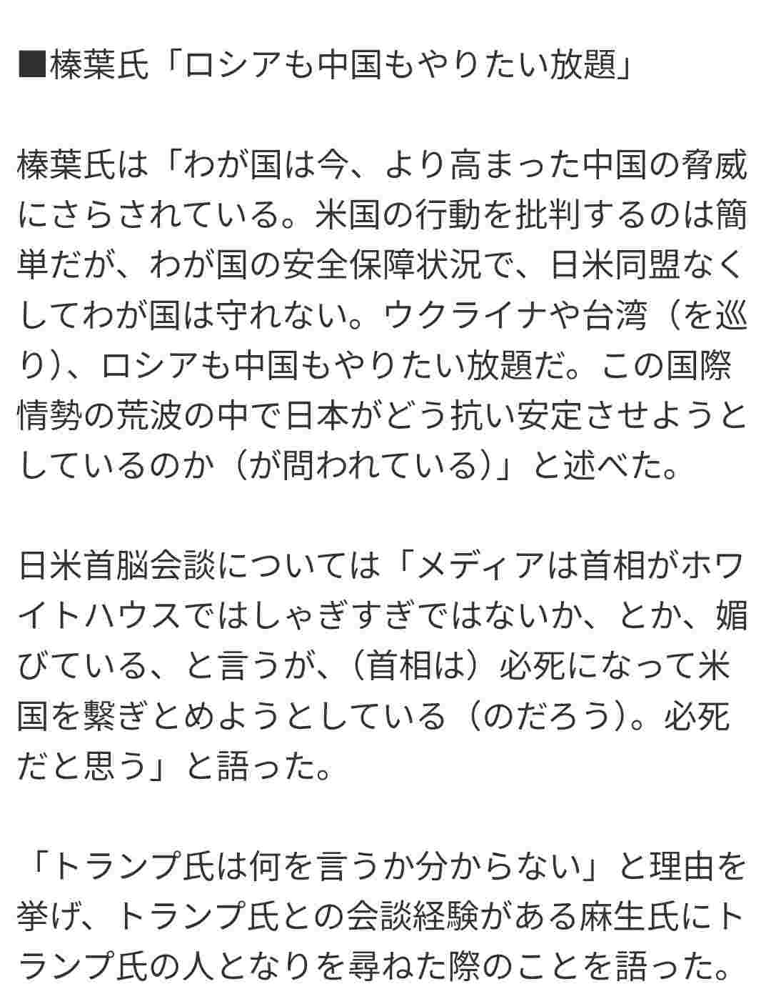 榛葉氏は「わが国は今、より高まった中国の脅威にさらされている。米国の行動を批判するのは簡単だが、わが国の安全保障状況で、日米同盟なくしてわが国は守れない。