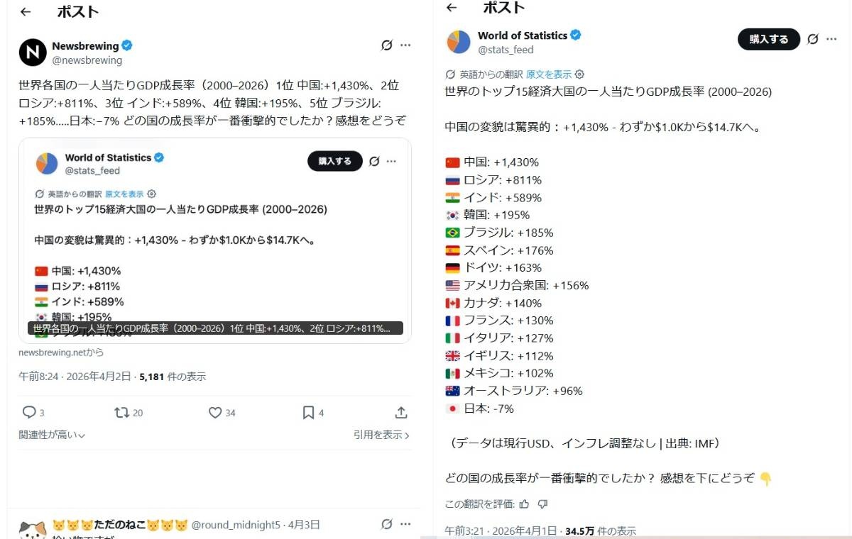 世界の一人当たりGDP成長率、中国1430%、ロシア811%、インド589%、韓国195%😲…日本-7%🤢