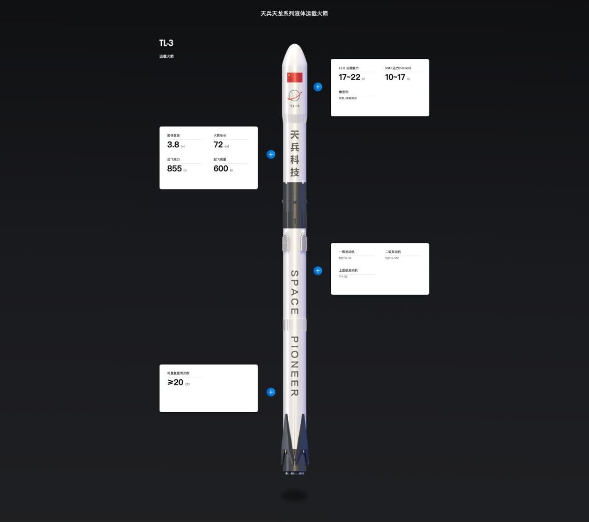 天龍3号は、Space Pioneerが中国の衛星インターネット構想向けに開発した大型の液体燃料ロケットです。全長約72m、機体直径3.8m、第1段には自社開発の「天火12(TH-12)」エンジン9基を搭載し、離昇時の推力は約8,000kNに達します。低軌道(LEO)への打ち上げ能力は約17トン、太陽同期軌道(SSO)へは約14トンとされており、将来的には第1段の垂直着陸による再使用も計画されています。推進剤は液体酸素とケロシンの組み合わせです。
