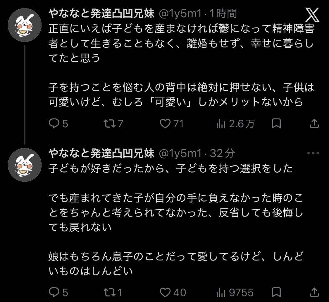 子供のせいで鬱になっただの、離婚しただの八つ当たりの他責思考にも程があるわ
