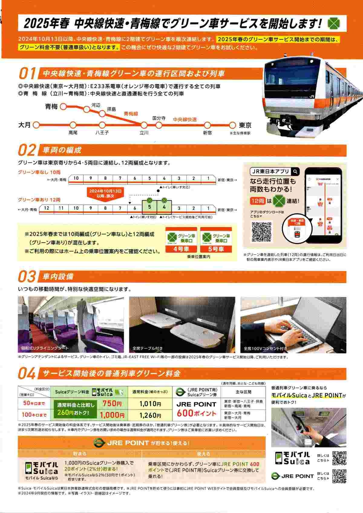 グリーン車は、着席サービスの提供や混雑緩和を目指し、東京―大月間を運行する中央線快速の全列車と、青梅線の立川―青梅間に直通運転する列車に導入された。24年10月に試験運行が始まり、昨年3月から本格運行されていた。