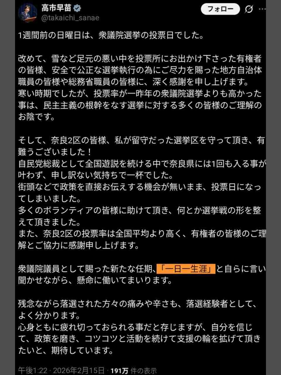 高市首相「一日一生涯で働く」 衆院選受け、Xに投稿(共同通信) - Yahoo!ニュース高市早苗首相は15日、自民党単独で3分の2を超える議席を獲得した衆院選を受け、自身のX(旧ツイッター)に「『一日一生涯』と自らに言い聞かせながら、新たな任期を懸命に働いていく」と投稿した。厳寒期のnews.yahoo.co.jp