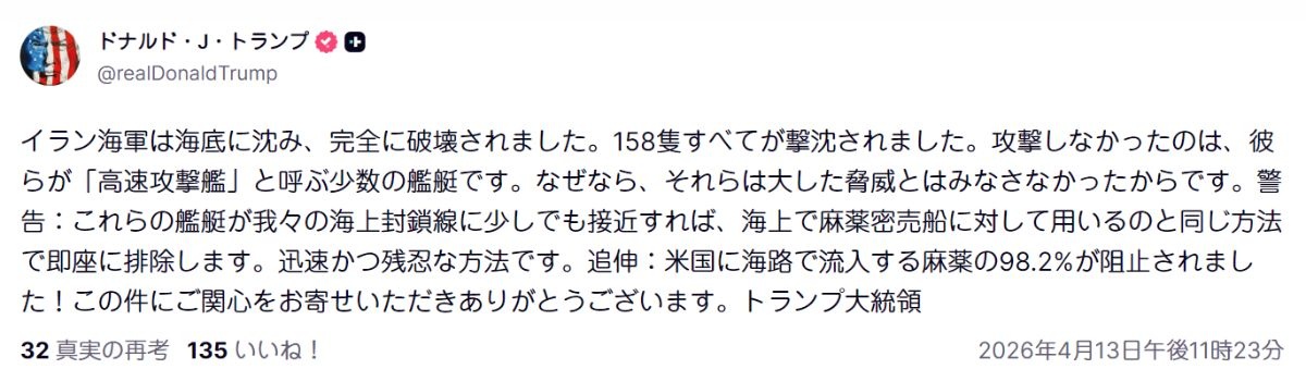 イラン海軍は海底に沈み、完全に壊滅した――158隻だ。我々が攻撃しなかったのは、彼らが「高速攻撃艇」と呼ぶ少数の艦艇だけである。なぜなら、それらを大きな脅威とは考えていなかったからだ。警告:もしこれらの艦艇のどれか一隻でも我々の封鎖線に近づこうものなら、海上で麻薬密売人の船に対して用いているのと同じ殺傷システムを用いて、即座に排除されることになる。それは迅速かつ容赦ないものだ。追伸:海路で米国に流入する麻薬の98.2%は阻止された!この件に関心を寄せていただき感謝する。大統領 DJT