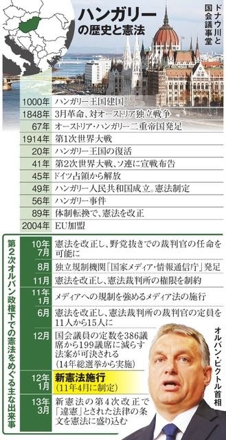 野党の反対を押し切って新たな憲法を作る。チェック機関である憲法裁判所の権限を弱める。その一方で、メディア規制を強化する――。ハンガリーで権力の一元化が進んでいる。