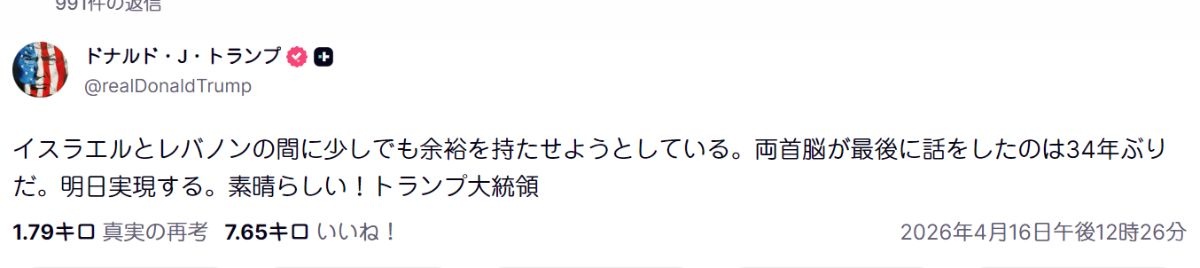 【高市朗報】トランプ「イスラエルとレバノンの間に少し余裕を持たせようとしている。両国の指導者が会談するのは34年ぶり。明日行われる