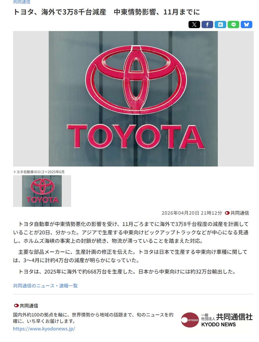 トヨタ、海外で3万8千台減産 中東情勢影響