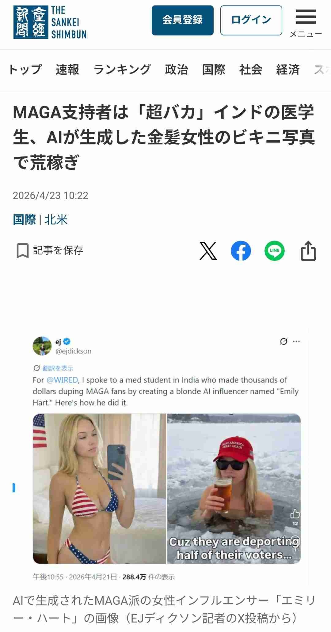 産経新聞、「MAGA支持者はAI美女に簡単に騙される超バカだらけ」という記事を掲載してしまう