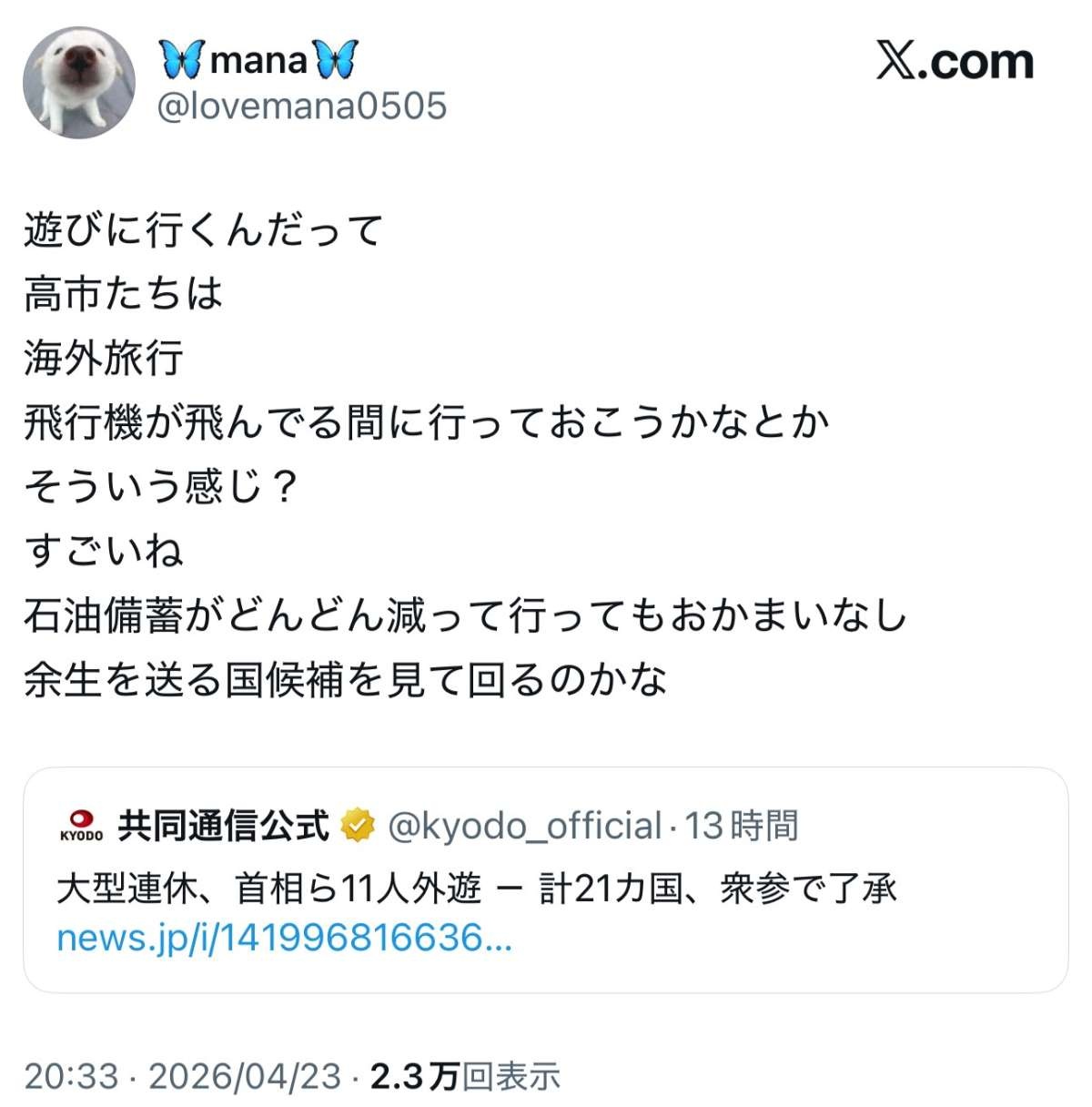 政治家ばっかり外国に遊びに行っててずるい😡