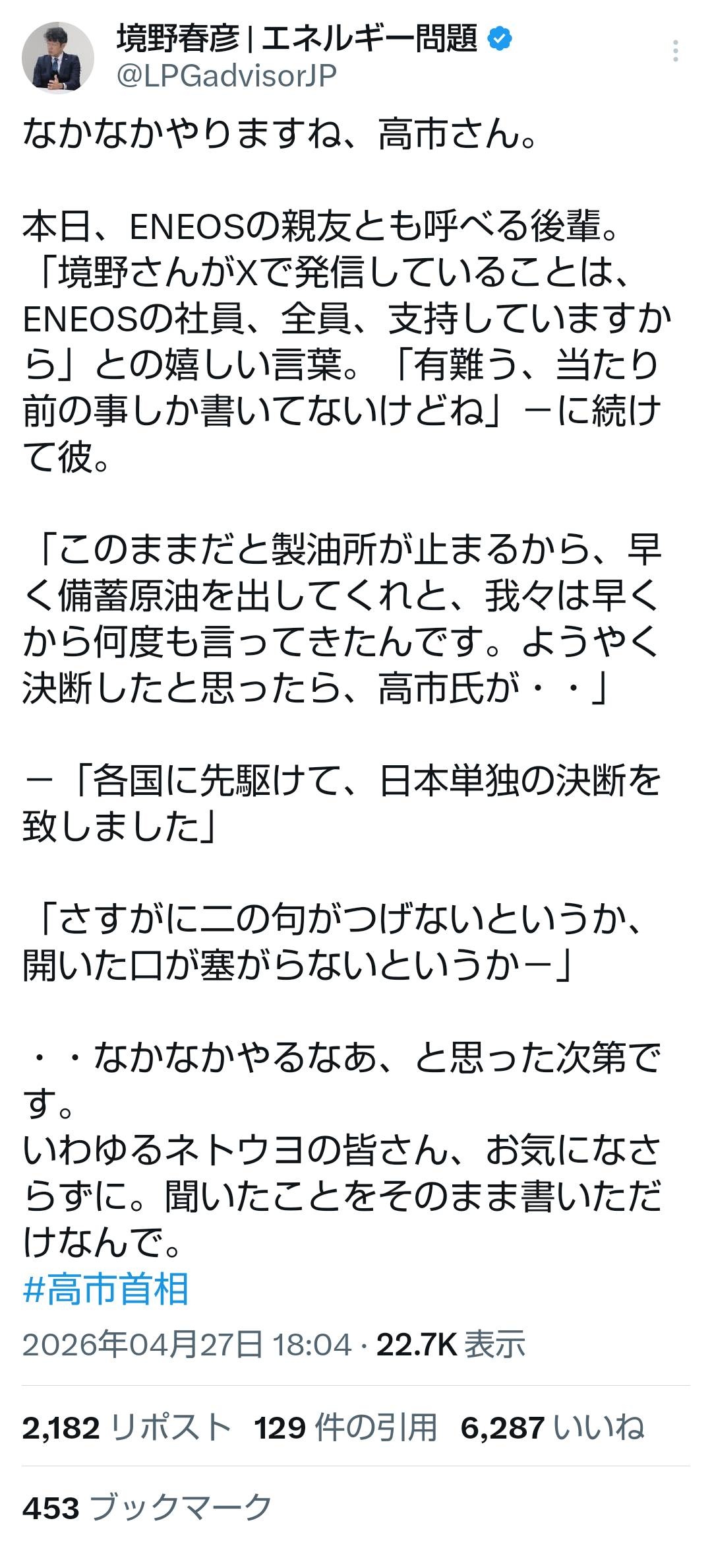 公式の発言でもないのにこんなこと言ってエネオスからクレームついたらどうすんだよ