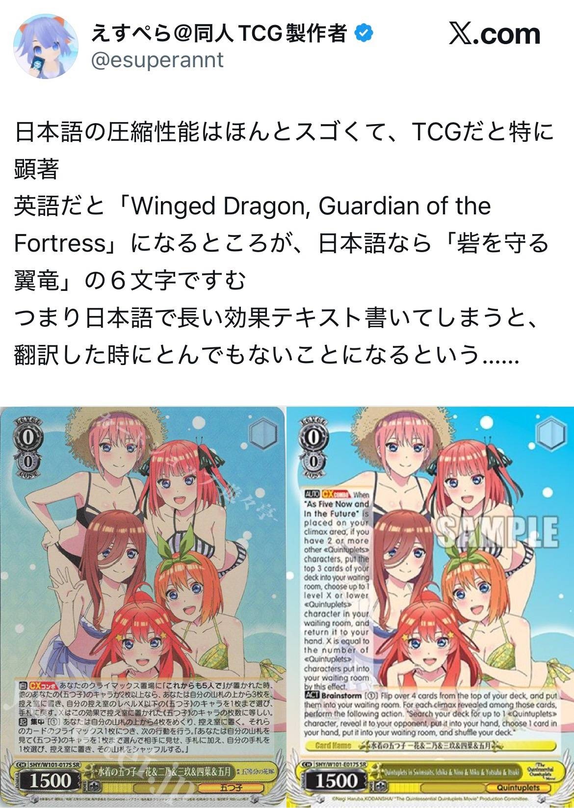実際のTCGの多言語版比較において、同一のカード効果を表示する際、中国語版はテキスト欄に最も余白が生まれやすいことが統計的に知られています。これは、表意文字のみで構成される中国語の性質に直接起因するものです。