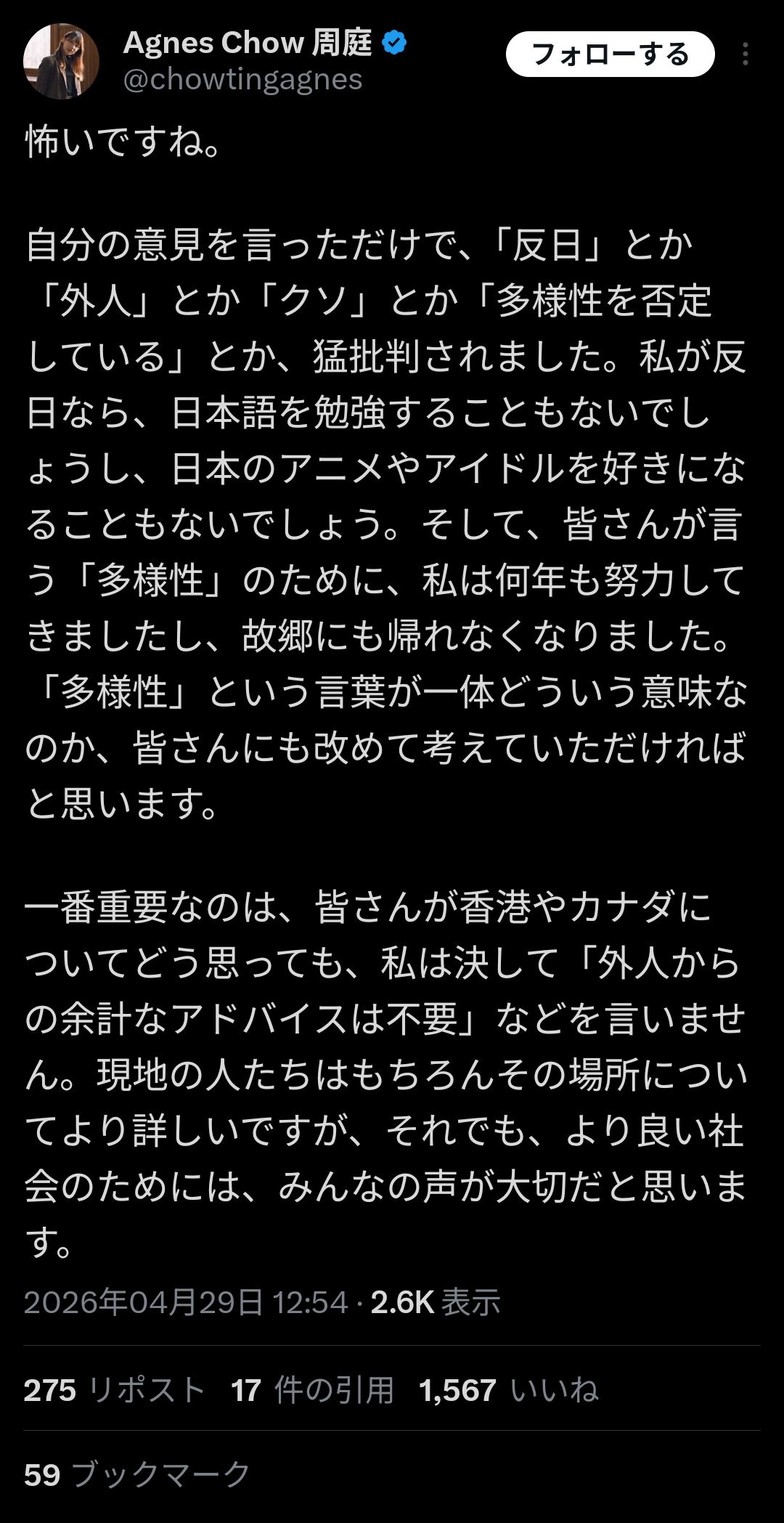 自分の意見を言っただけで、「反日」とか「外人」とか「クソ」とか「多様性を否定している」とか、猛批判されました。私が反日なら、日本語を勉強することもないでしょうし、日本のアニメやアイドルを好きになることもないでしょう。そして、皆さんが言う「多様性」のために、私は何年も努力してきましたし、故郷にも帰れなくなりました。「多様性」という言葉が一体どういう意味なのか、皆さんにも改めて考えていただければと思います。