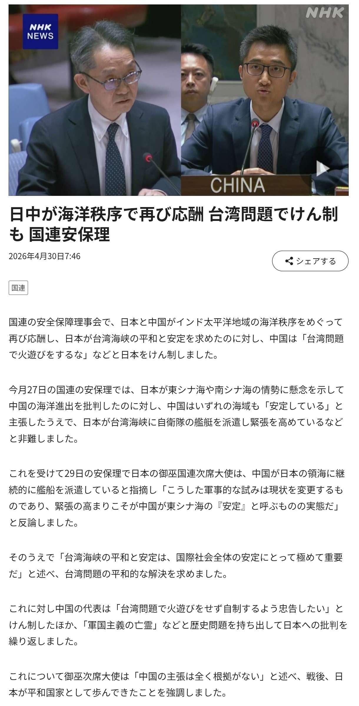 これを受けて29日の安保理で日本の御巫国連次席大使は、中国が日本の領海に継続的に艦船を派遣していると指摘し「こうした軍事的な試みは現状を変更するものであり、緊張の高まりこそが中国が東シナ海の『安定』と呼ぶものの実態だ」と反論しました。