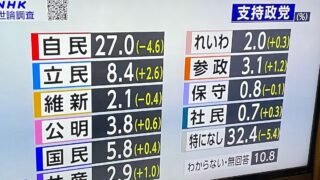 嫌儲 【世論調査】自民党27%立民8.4%国民5.8%公明3.8%参政党3.1%共産2.9%維新2.1%れいわ2%保守0.8%社民0.7%なし32.4%