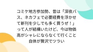 嫌儲 地方コミケ民「深夜バスでお金を浮かせて同人買うべ!」 →高くなりすぎてコミケ行けない。