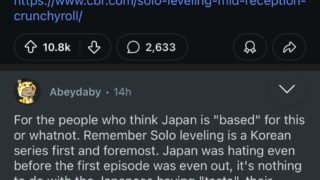 嫌儲 外人、気付く「日本でだけ俺レベ(俺だけレベルアップな件)の評価が低いのはアニオタに嫌韓が多いから」10万いいね