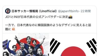 なんG サッカー日本代表が韓国国旗のようだと話題に…韓国事務所アイドルJO1とINIが公式アンバサダーに