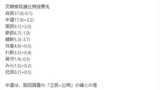 嫌儲 【世論調査】比例投票先、中道改革連合46.8自民12.4国民7.3