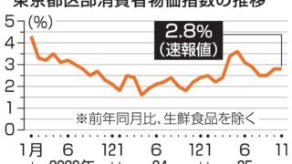嫌儲 11月の東京物価2.8%上昇、値動きの大きい生鮮食品を除く、コメ類の上昇率は37.9%、体感物価は、実際の上昇率より大幅値上がり、高騰か