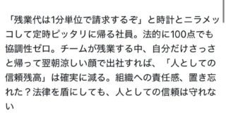 なんG 弁護士「定時ピッタリに帰る社員。法的に100点でも協調性は0。人としての信頼残高が確実に減ってます」