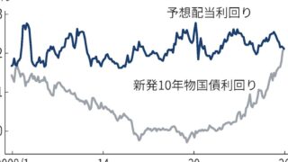 嫌儲 日本株配当利回り、長期金利下回る、17年半ぶり逆転、株高による配当利回りの低下と金利上昇が同時に進み、逆転が生じた